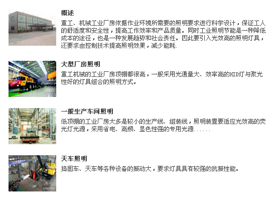 重工機(jī)械的工業(yè)廠房頂棚都很高,一般采用光通量大、效率高的HID燈與聚光性好的燈具組合的照明方式。從頂棚高度與設(shè)計(jì)照度方面考慮,需要選擇合適的配光燈具。安裝高度在10-30m的情況下,建議使用高強(qiáng)度氣體放電燈配以超高架燈具或泛光照明燈具,其效果要超過(guò)使用熒光燈的效果。